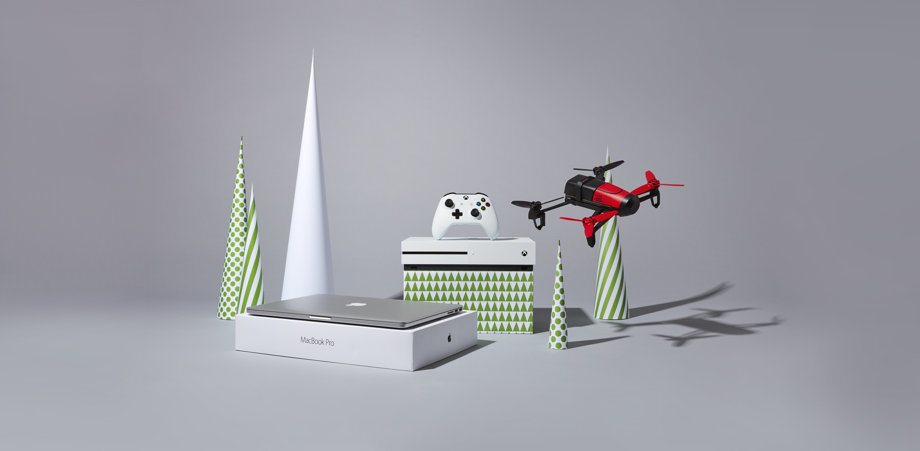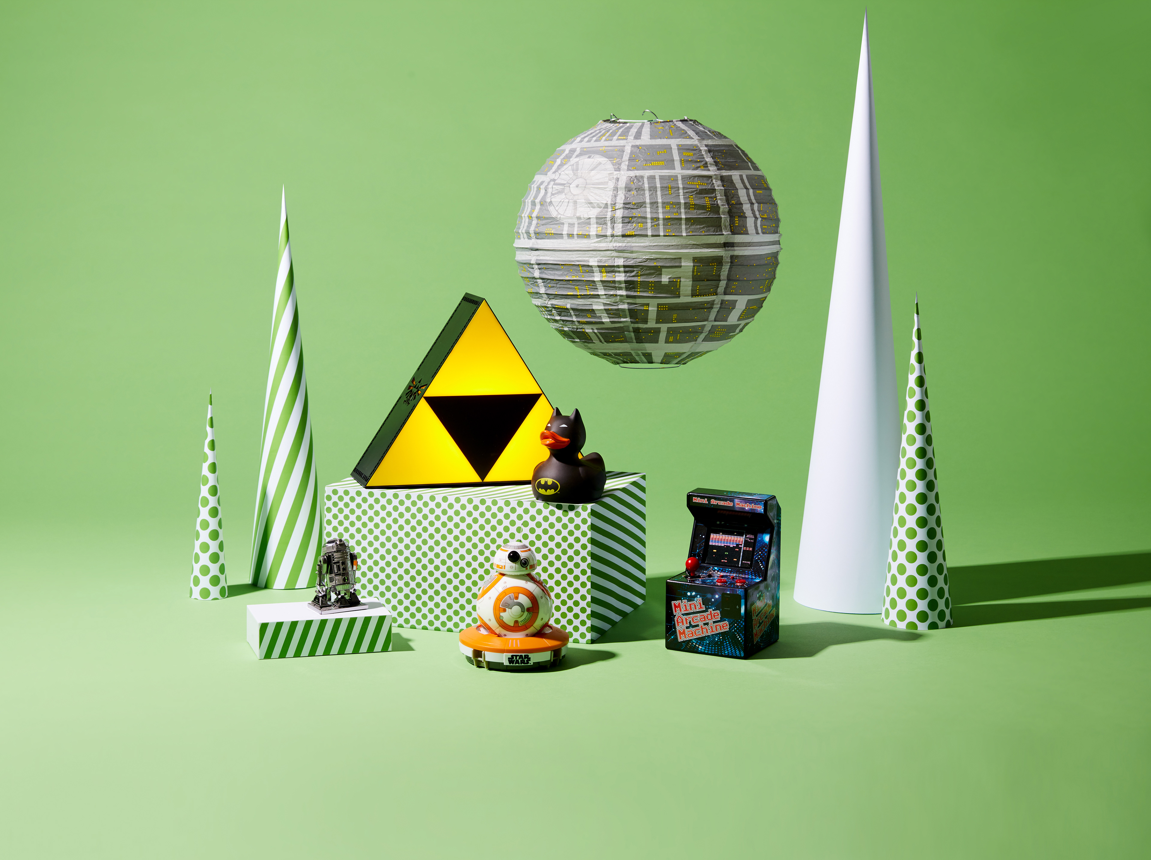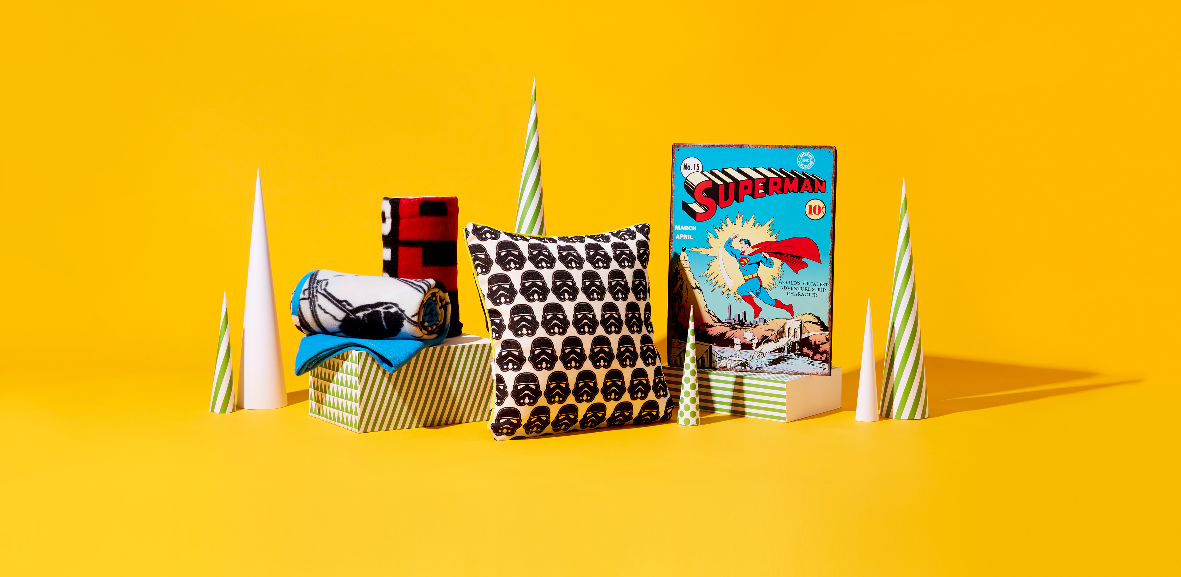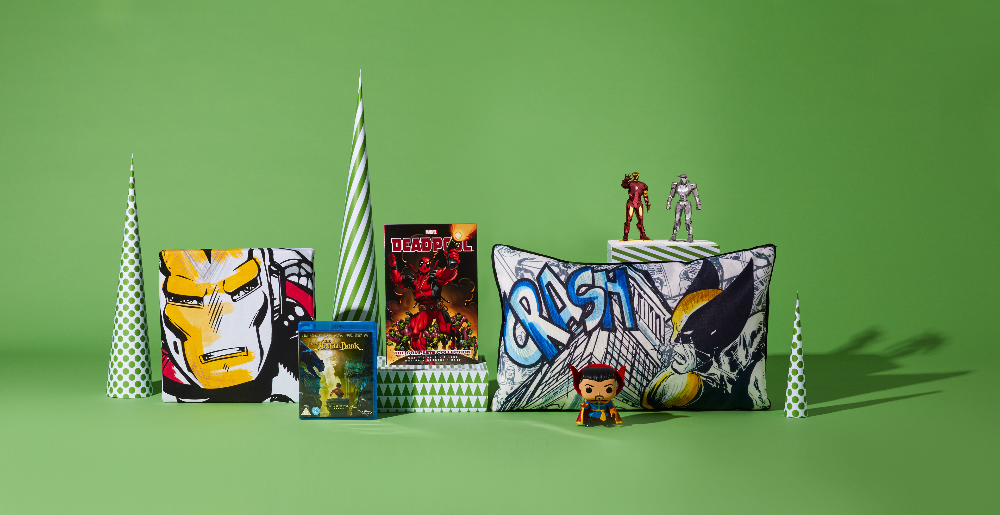 Showcase of all Zavvi products during the Christmas period. Campaign message, 'Wrapped Up' using brand colours as the colourama backdrop. Minimalistic approach with the Polka dots and striped cones to represent as the Christmas Trees.